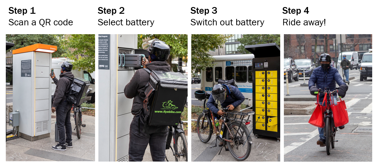 Supporting NYC's 65,000+ delivery workers with safe, reliable options for quick exchanges of depleted batteries for fully charged ones—saving time, increasing earnings, and avoiding dangerous charging setups.